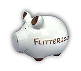 Süßes Sparschweinchen in weiß aus Keramik mit der geprägten goldenen Aufschrift „Flitterwochen“.